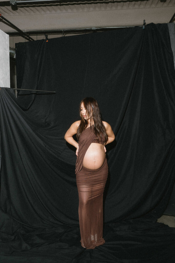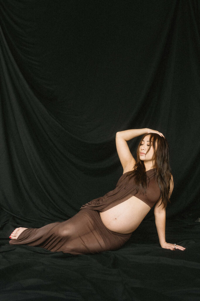We started with soft daylight and classic poses that highlighted Linh’s growing bump. Then later, transitioned to something bolder with rich chocolate draping. The play of light against those warm tones felt both elegant and intimate. Later, switching to a darker backdrop shifted the mood entirely, giving us a chance to capture something moodier and more artistic.